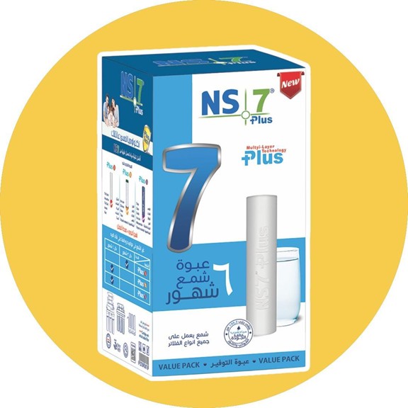 - مسام شمعة NS7 تبدأ من 5 ميكرون وتضيق حتى 1 ميكرون و الذى ينقى 10 مرات شوائب أصغر عن الشمعات العادية و بذلك يضمن تنقية المياه بنسبة تصل الى 99.9% من الشوائب.